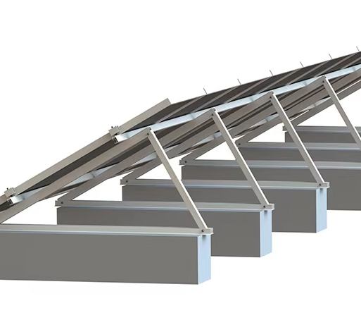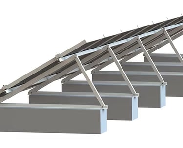 The adjustable tilt flat roof mounting system will easily fit different flat roofs or open terrain applications, due to its variable tilt angle and footing options for both roof clamp and roof penetration.